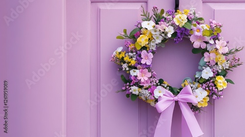 Pastel Colored Flower Wreath with Ribbons on Purple Door