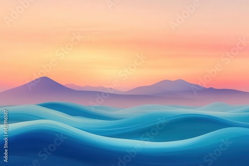 Pastel colored landscape with rolling water and mountains.