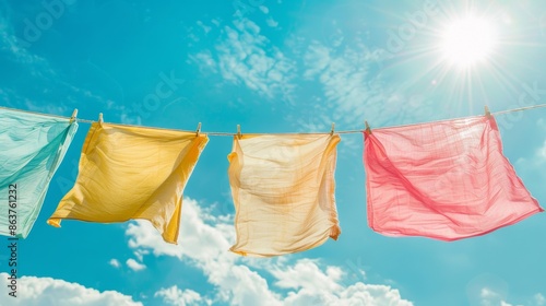 Pastel colored sheets hanging to dry on a clothesline against a background of blue sky, capturing a serene and domestic scene