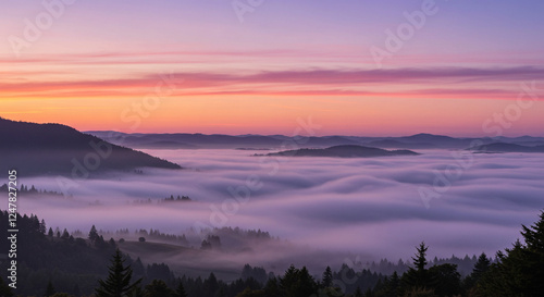 Pastel Colored Sunset Over Misty Valley