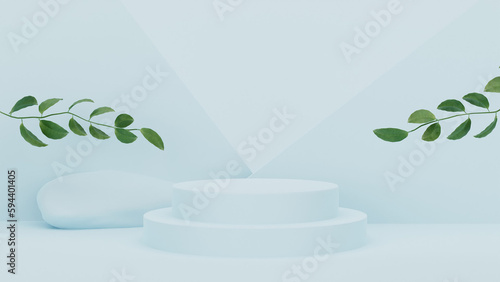 Pastel colour podium made on background with plant branches,leaves,pebbles and natural stones.Mock up for the exhibitions,presentation of products, therapy, relaxation and health. 3d render.