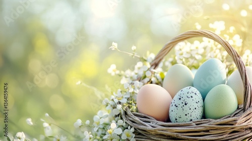 Pastel Easter egg basket with chocolate bunnies and spring flowers, radiating warmth and joy.
