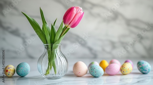 Pastel Easter Eggs and Pink Tulip in Glass Vase Springtime Still Life Photography