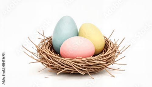 Pastel Easter eggs arranged in a rustic wicker nest on a clean white background