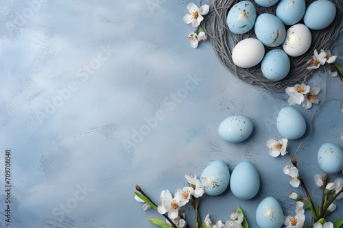 Pastel Easter Eggs in a Nest, Surrounded by Pink and White Flowers on a Pale Blue Background - Embracing Minimalism with Space for Your Text