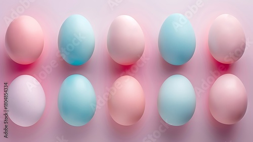 Pastel easter eggs in alternating pink and blue colors arranged on a light pink background surface