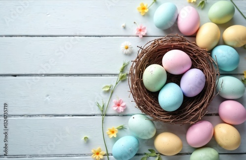 Pastel Easter eggs in nest with spring flowers on white wooden table. Holiday arrangement. Traditional colors yellow pink blue green lilac. Modern minimalistic design, festive food composition.