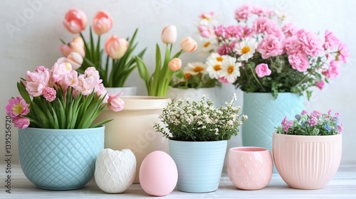 Pastel flower arrangement with tulips and daisies in stylish pots