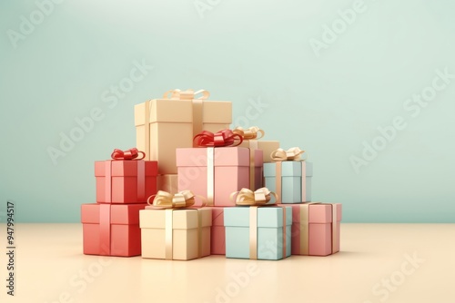 Pastel gift boxes on green background. .