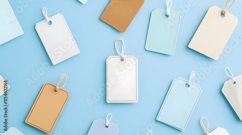 Pastel gift tags on blue background; mockup for branding, design, crafts.