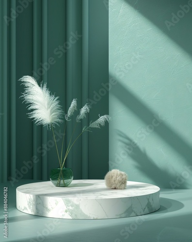 pastel green background with marble stone podium, marble pedestal, fashion industry, object display with beauty and feminim styl;e decoration