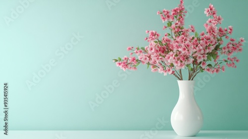 Pastel green walls complementing pink flowers in a white vase on a table, offering a soothing and stylish look with ample copy space