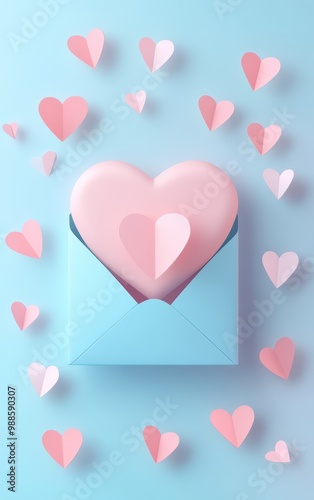Pastel hearts in an envelope on a blue background, creating a romantic theme.