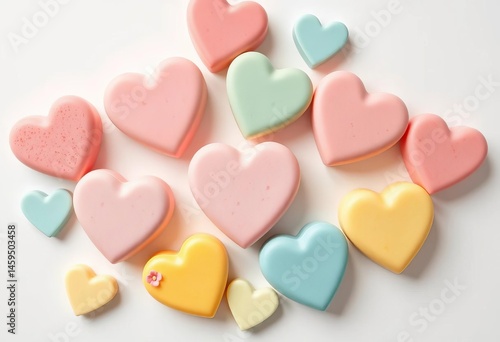 Pastel heart-shaped soaps, arranged on white background, handmade, smooth