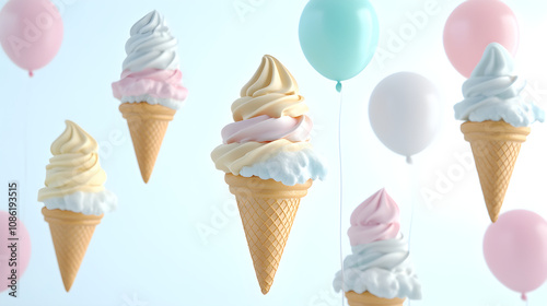 Pastel ice cream cones floating in the air with clouds or pastel balloons attached