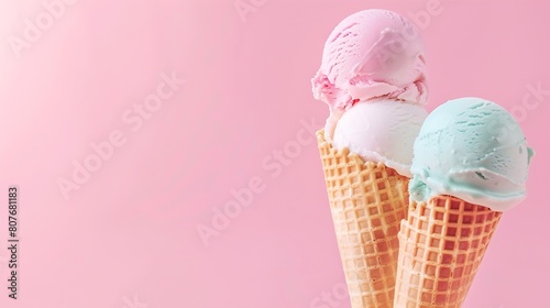 Pastel ice cream in waffle cones bright background copy space : Generative AI