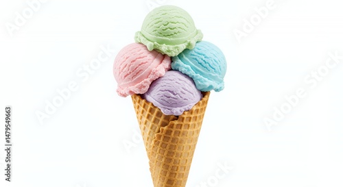 Pastel Ice Cream Waffle Cone with Four Flavors Isolated on White Background for Clip Art and Summer Promotion