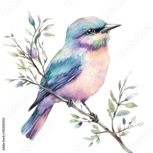Pastel Illustration of a Colorful Bird Perched on a Branch Surrounded by Delicate Leaves