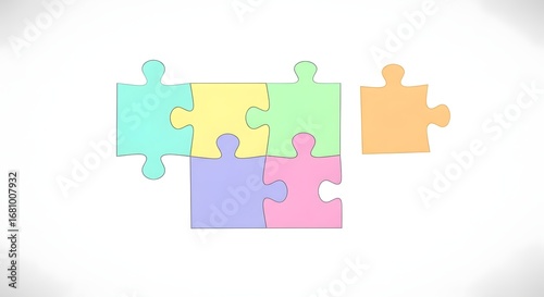 Pastel Jigsaw Puzzle Pieces on White: Connected Group and Separate Piece. Concept of Teamwork, Problem-Solving, and Integration.