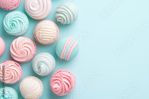 Pastel macarons and cupcakes on soft pastel background, sweet minimal dessert composition.