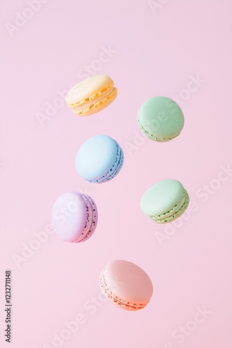 Pastel macarons floating on pink background. Sweet dessert and confectionery concept. Image for bakery and cafe content. Banner view with copy space.