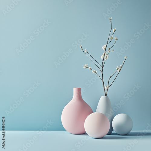 Pastel matte spheres with smooth surfaces and rounded edges are set against a soft blue backdrop, featuring a minimalist vase with a single flower inside .Minimal creative art concept.Copy space