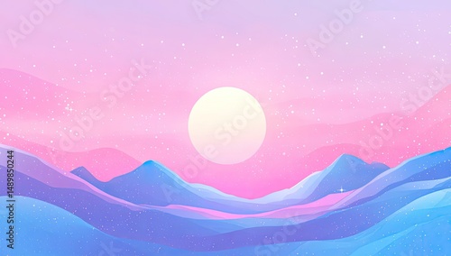 Pastel mountainscape at sunrise. Soft pink and blue hues. Large, bright sun. Delicate stars
