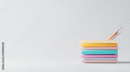 Pastel Notebooks Stacked Pencils Minimalist Style High Resolution Close-up Shot Soft Edges Neat Organization Study Supplies White Background Soft Gentle Hues Educational Branding