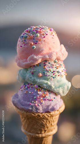 Pastel Perfection: A Tempting Trio of Scoops on a Waffle Cone in Sunlit Bliss