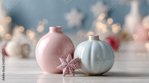 Pastel pink and mint ceramic vases with glittery pink star ornament on light wooden table, soft bokeh lights and blurred festive background create calm, cozy holiday mood