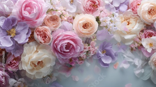 Pastel Pink and Purple Rose Flower Arrangement on Light Blue Background