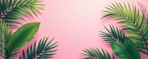 Pastel pink backdrop, lush colorful palm leaves, botanical art Sunny tropical vibe , decor, aesthetic, image