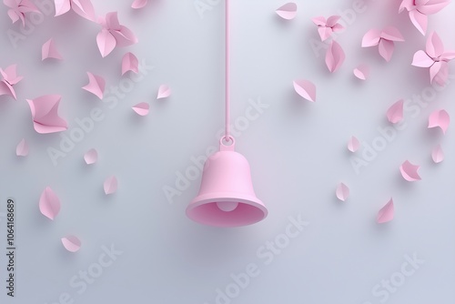 Pastel pink bell hanging with falling petals on gray background, minimalist design