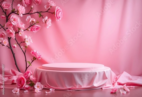 Pastel pink blossom backdrop with rose, cloth, and a beautiful podium for product display, mockup, render