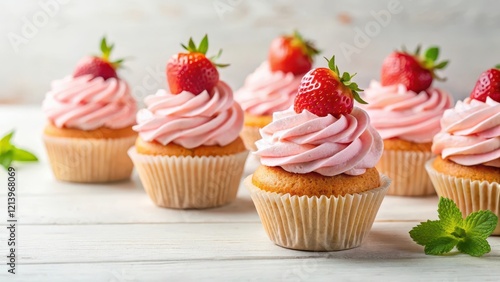 Pastel pink cupcakes with fresh strawberries and whipped cream on a white background, cake, dessert