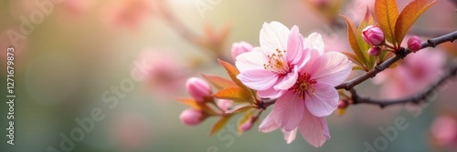 Pastel pink pear flowers bloom on tree branches, leaves, gentle, hues