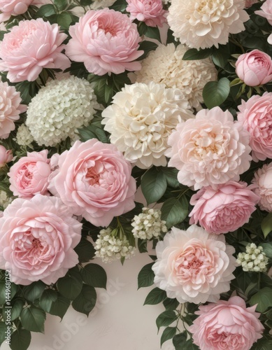 Pastel pink roses, peonies & hydrangeas; vintage floral wall backdrop, bloom, blossom