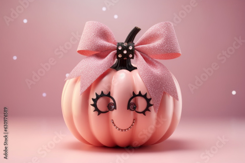 Pastel pink y2k Halloween pumpkin with sequins. Minimal Holiday season concept background. Generative AI.
