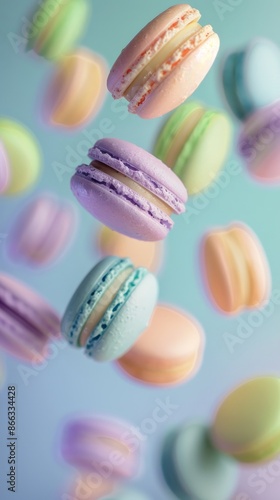 Pastel purple, green, blue, cream and yellow colored macaroons floating in the air