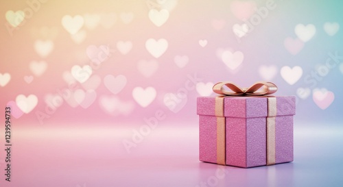 Pastel rainbow background with multiple floating hearts in soft focus, a single gift box in sharp