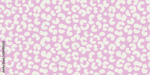 Pastel seamless leopard print pattern with white spots, organic shapes on a soft pink background. Bold, modern, and trendy design ideas for textiles, fashion, creative branding projects.