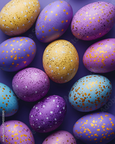 Pastel speckled Easter eggs arranged on purple background