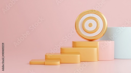 Pastel staircase leading to a golden goal icon representing wealth and success in a dreamlike environment