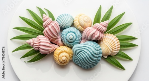 Pastel-colored confectionery in various shell shapes artfully arranged with green leaf elements on a white plate against a bright background