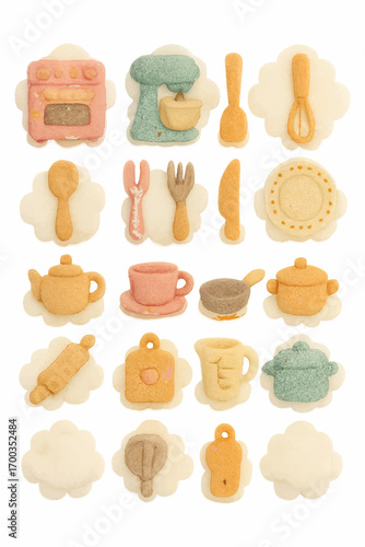Pastel-colored kitchen themed cookie cutters or decorative elements.