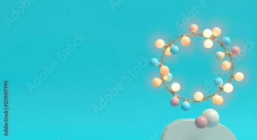 Pastel-colored light bulbs arranged in circular pattern on blue background