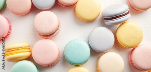 Pastel-colored macarons arranged on a white background, food photography, confectionery