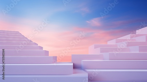 Pastel-hued abstract stairs under a bright sky, casting soft shadows