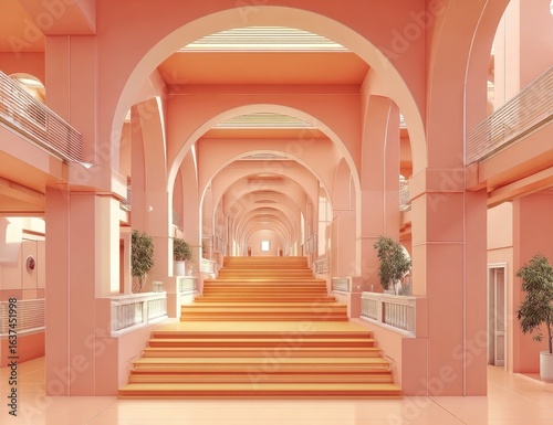 Pastel-hued archway hallway with grand stairs