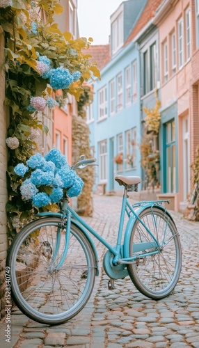 Pastel-toned alleyway with a vintage blue bicycle and hydrangeas